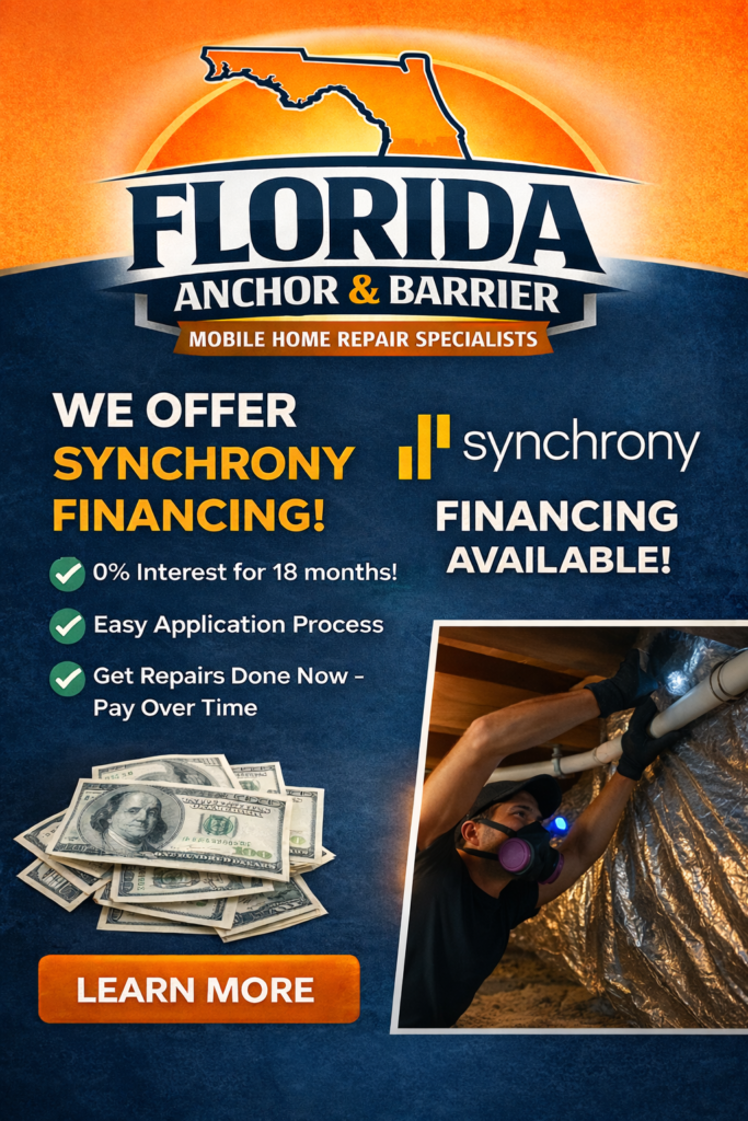 Great news for Florida homeowners! Synchrony Financing is now available through Florida Anchor & Barrier, making it easier than ever to repair and upgrade your mobile home without the stress of large upfront costs. Financing can be used for all our services — including vapor barrier replacement, hurricane anchors, floor repair, carports, gutters, and siding. There are even two zero-interest options.